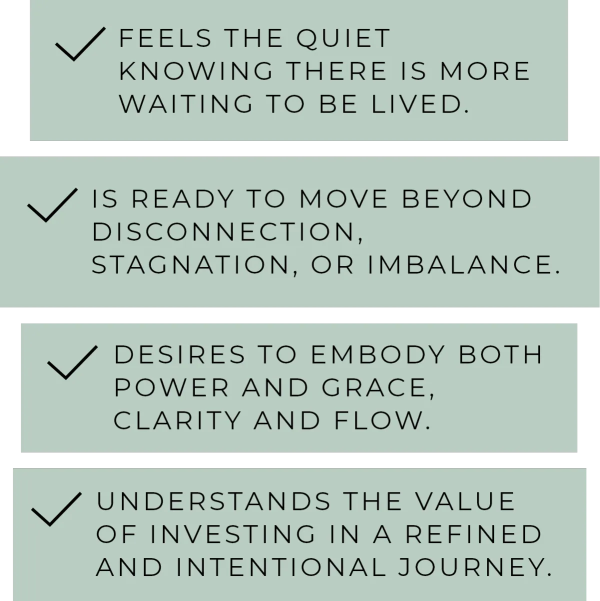 I coach with depth, presence, and discernment. I I only ask of my clients what I know is possible because I’ve done the work, walked the path, and live the results. This is a space for people who think deeply and feel fully. I won’t tell you who to be, but I will help you to listen to and return to the truth of who you are, where you can authentically step into the grandest version of who you were always meant to be.