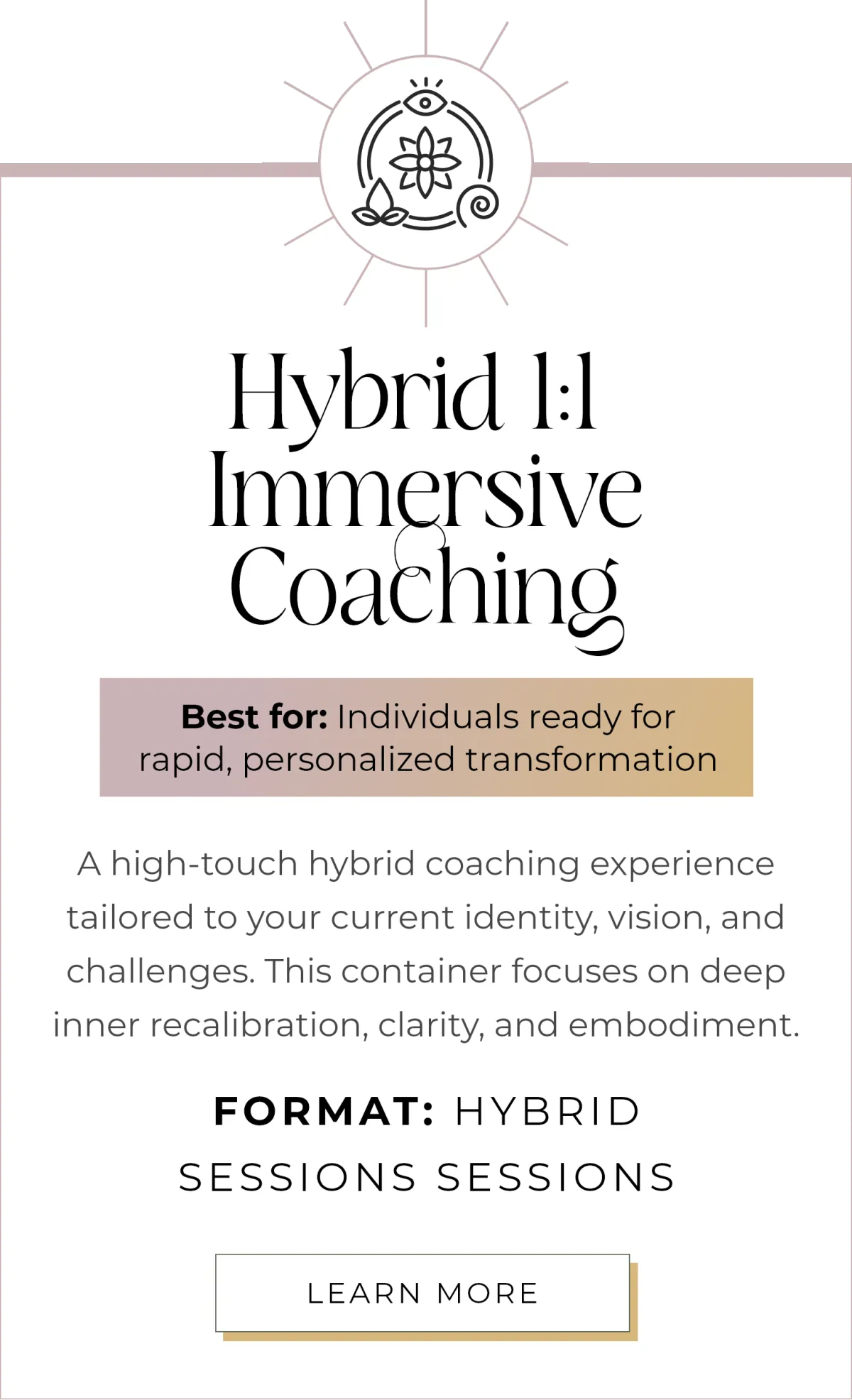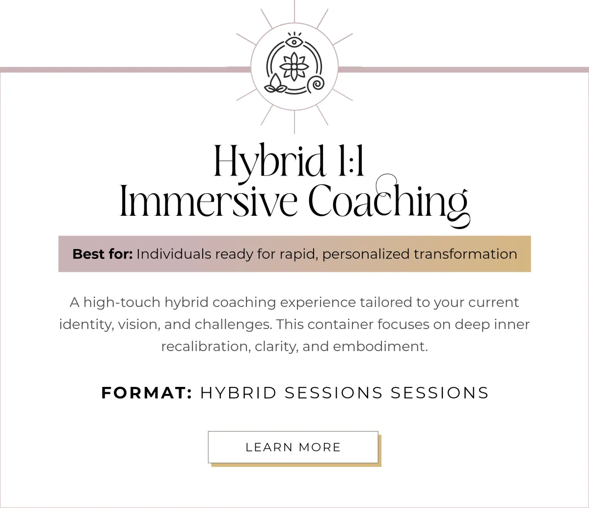 For individuals ready to rise into their grandest identity, my coaching programs offer deep inner work, guided expansion, and the tools to embody lasting transformation. This is not surface-level motivation — it is conscious evolution.